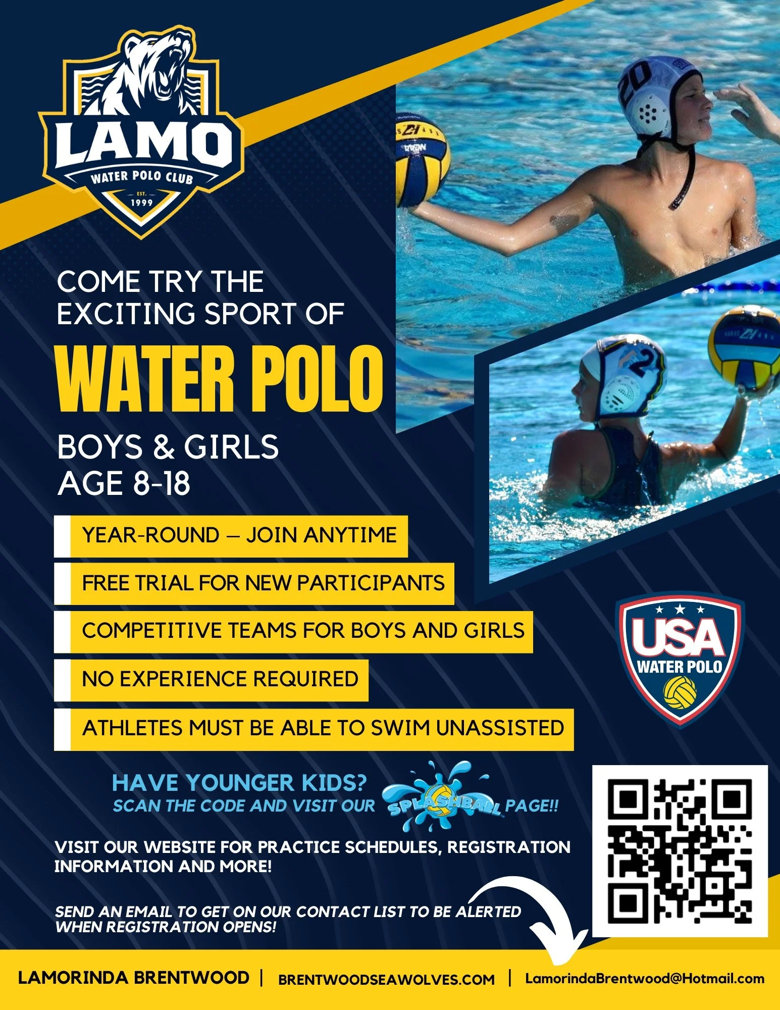 LAMO Brentwood offers a one-week (3 practices) free trial every season for new athletes of all ages. No water polo experience is necessary, however, participants must be able to swim unassisted.